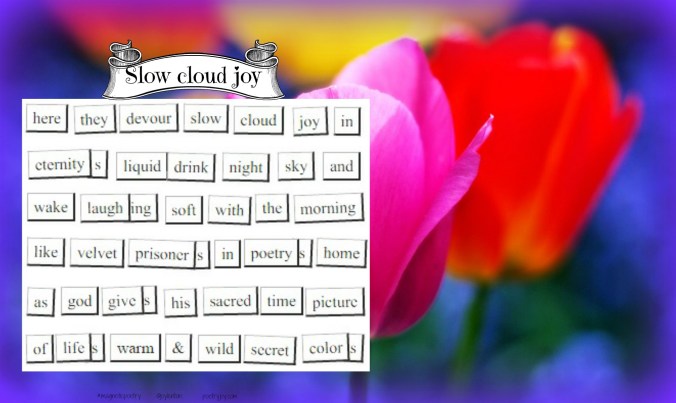 • Gayl, I know just how frustrating this can be: “I started a magnetic poetry poem but couldn’t seem to make the words work”, because word wrangling is even more evident when we rely on the whims of magnetic poetry’s offering. I frequently have to let go of an idea or rearrange a few words as they appear to shape themselves differently then I’d hoped or anticipated!
