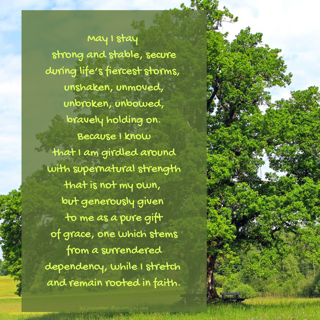 Growing I want to grow slowly, like moss. Spread out with lively verdancy, stay bright and fresh, remain green-leaved. May I carpet my mind, my interior castle, my spirit with holy wisdom, with resiliency I can confidently walk upon with ease. Let me be rooted like a sturdy oak tree which freely spreads itself—its bark, branches, trunk and leaves across the forest floor because sunlight invites it to, and it knows how to grow and mature. May I stay strong and stable, secure during life’s fiercest storms, unshaken, unmoved, unbroken, unbowed, bravely holding on. Because I know that I am girdled around with supernatural strength that is not my own, but generously given to me as a pure gift of grace, one which stems from a surrendered dependency, while I stretch and remain rooted in faith. © joylenton