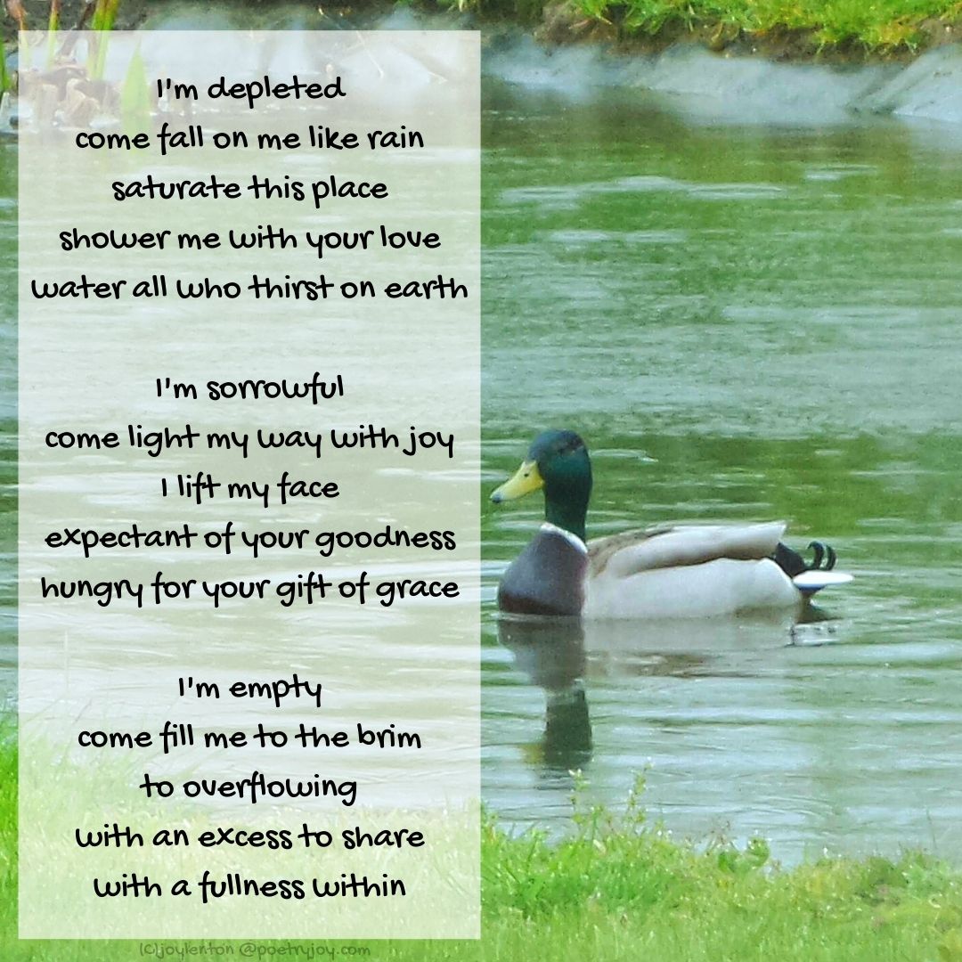 Restoration I'm depleted come fall on me like rain saturate this place shower me with your love water all who thirst on earth I'm sorrowful come light my way with joy I lift my face expectant of your goodness hungry for your gift of grace I'm empty come fill me to the brim to overflowing with an excess to share with a fullness within I'm worried come soothe away the cares take the burdens lift them from my weary frame help me find relief in prayer I'm praising come rejoice and celebrate my heart ached God gave me his rest and peace now his child has her soul eased © joylenton