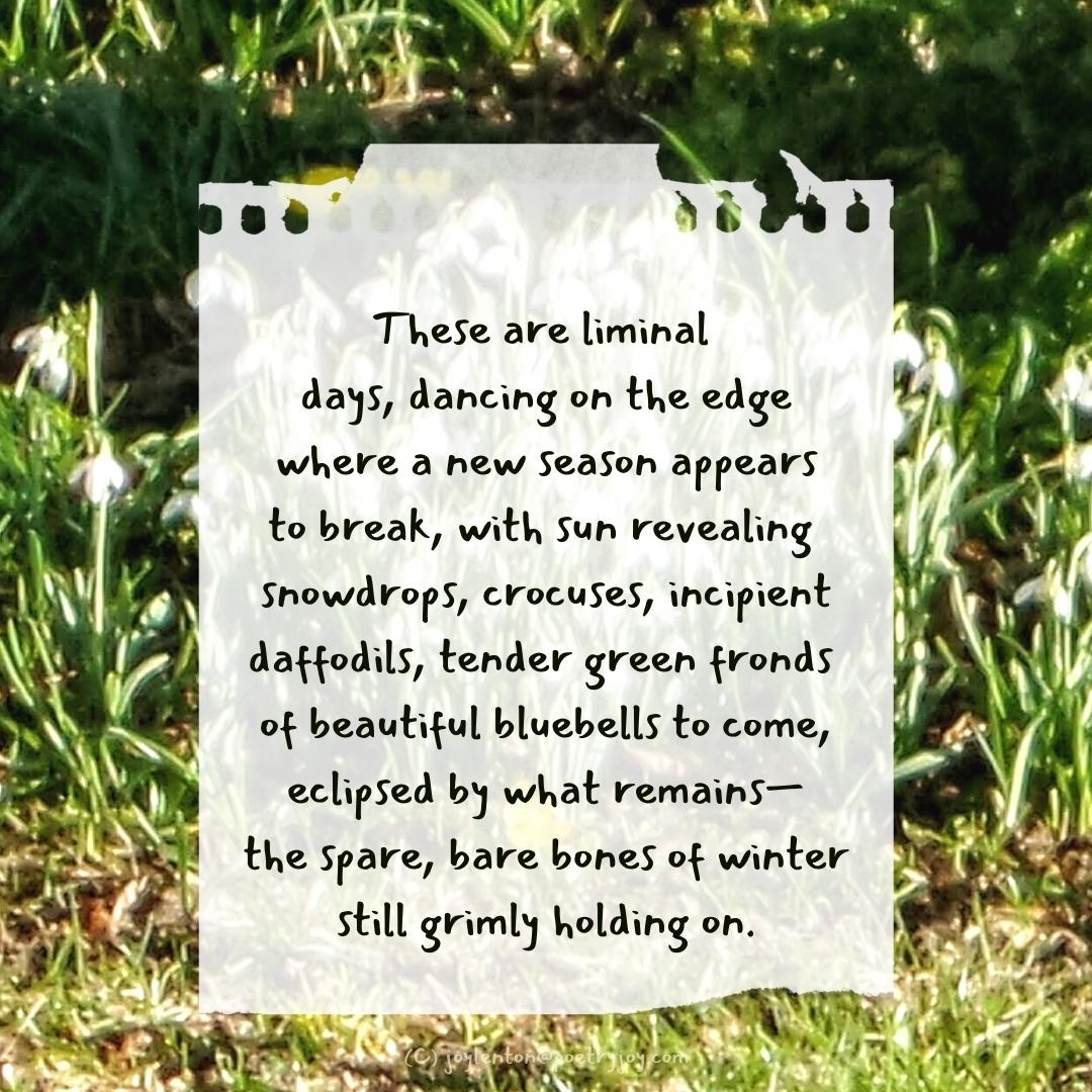 Liminal days Caught in apricity as I savour the unexpected warmth of this wintry sun, arriving soon after a deluge of rain, witnessing the drama which unfolds in contrasts, where light kisses dark and light doesn’t pull back because it carries difference in its golden heart. These are liminal days, dancing on the edge where a new season appears to break, with sun revealing snowdrops, crocuses, incipient daffodils, tender green fronds of beautiful bluebells to come, eclipsed by what remains— the spare, bare bones of winter still grimly holding on. My soul sits in ice sometimes because it’s waiting for a thaw to relax it into love, plant it in peace, persuade it to take a deeper breath, a longer look, a calmer exhale, and to shift gratitude to a whole new level, as I face the need to open up to mercy flowering from above. It isn’t arduous, it doesn’t take much at all for us to reorient ourselves back to joy and faith when we see evidence of spring, note vital change occurring and sense our souls being set adrift, freed from winter’s harsher grip, as we float calmly toward signs of hope unzipped. © joylenton