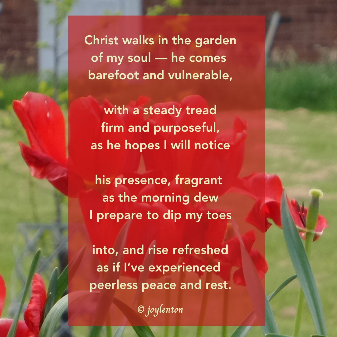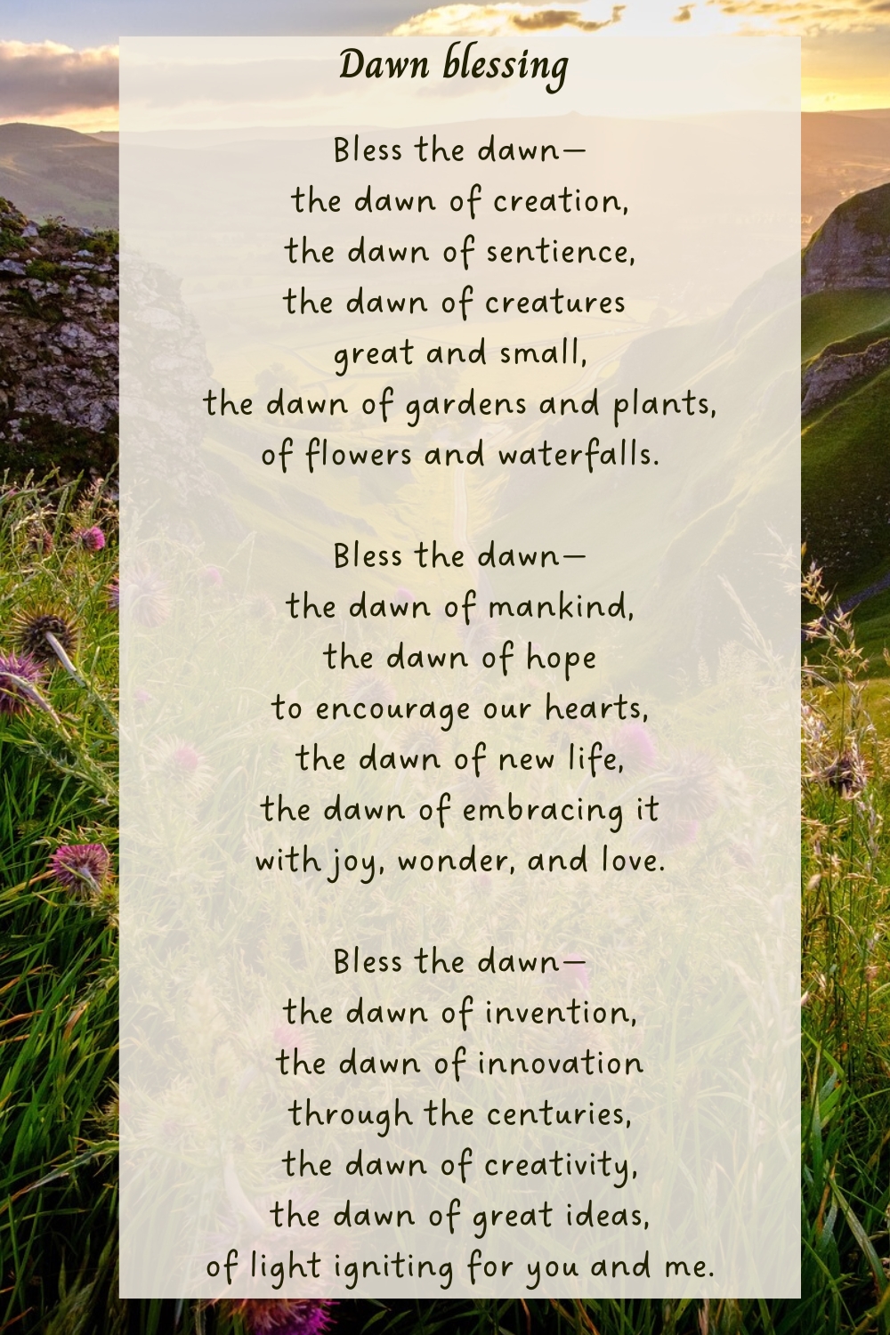 Splash of glory Sunlight laps at the edges of fading night, lifts its concealing cloak by slow increments as dawn begins to break and a sleepy world awakes. Petals unfurl themselves to welcome sun, spread wide their fragrant arms like a benediction quivering in the breeze as they bless who they please. Birds announce their presence— morning chorus resounds into skeined sky as orchestrated hymns of grateful praise rise, fill the airways. It’s new every morning, old as the hills, this bright splash of glory freely fills and spills, lifts our hearts heavenward in reverence and awe. © joylenton