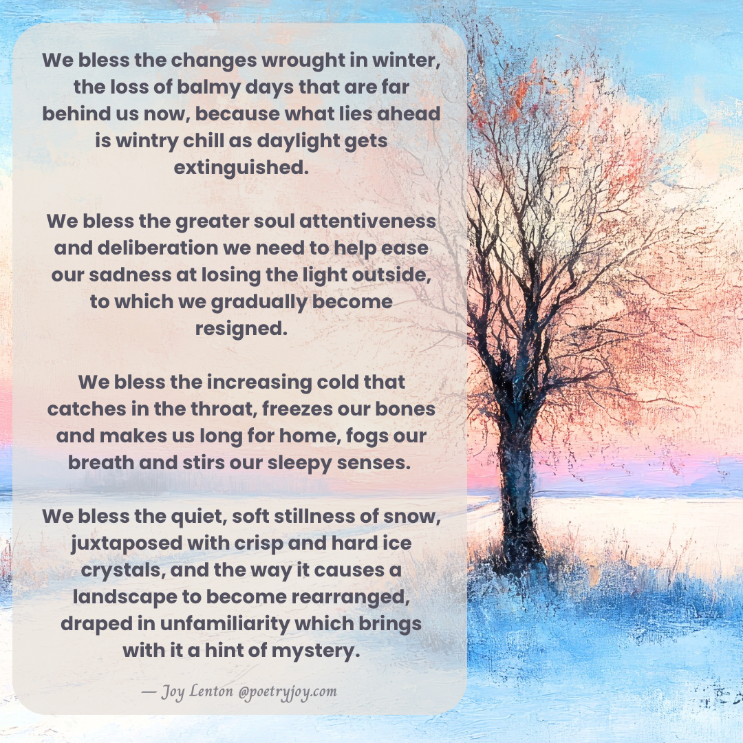 We bless the changes wrought in winter, the loss of balmy days that are far behind us now, because what lies ahead is wintry chill as daylight gets extinguished.
