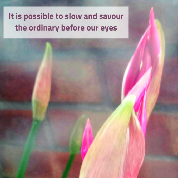 Awareness I might sense the slight tightening of a stitch, an awareness of being hemmed in, then easily miss the way you weave your miracles in the mundane. Unless my eyes are open, noticing, ready for a surprise, prepared to watch and see what lies behind the ordinary, then I could glimpse the deftly woven warp and weft of your holy threads, your embroidering. Although it is more than a visual response, more than a second glance required to observe a sacred hand at work, a gentle touch igniting the humble soil of earth. Because you ask me to look inwardly as well as outwardly, to catch the softest tread of your footsteps inside my expectant heart as you walk, fill it with your love, your presence, and your thoughts. © joylenton